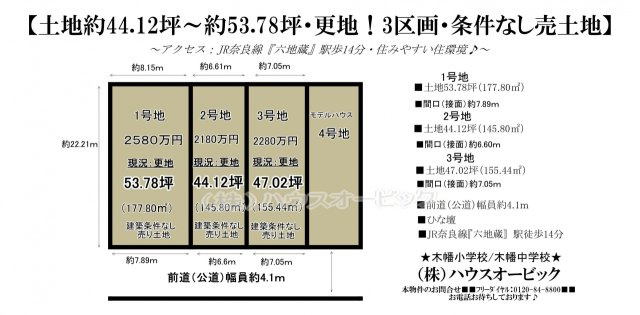宇治市 木幡御蔵山 土地 2号地(土地44.12坪・条件なし・南向き)