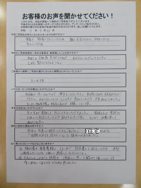 - 2020年3月から家の売却を依頼し4月には大体決まり6月11日に決済、引渡し無事終了しました。